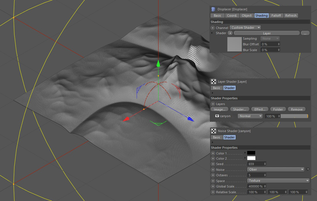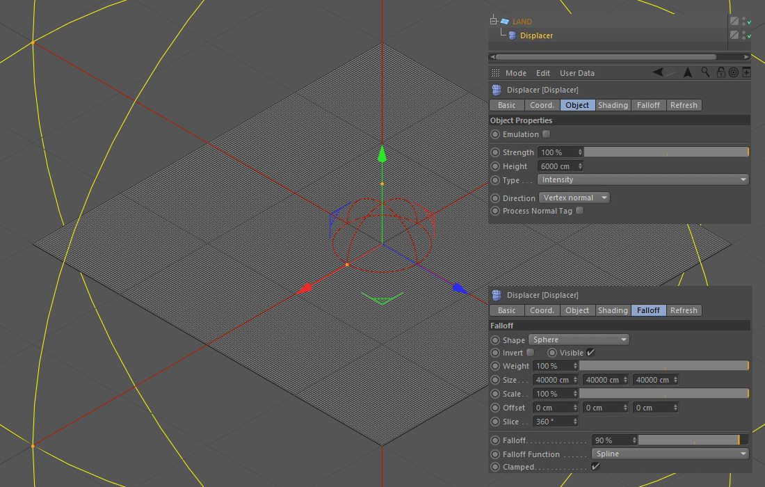 Then I added a Displacer Deformer to the plane, giving it an appropriate height. Falloff can be used to get it flatter on the border (this is optional).