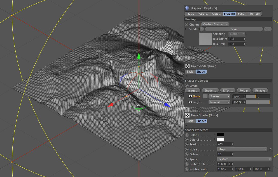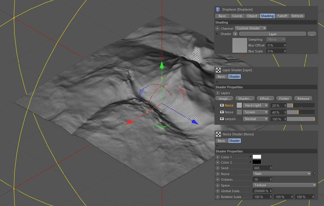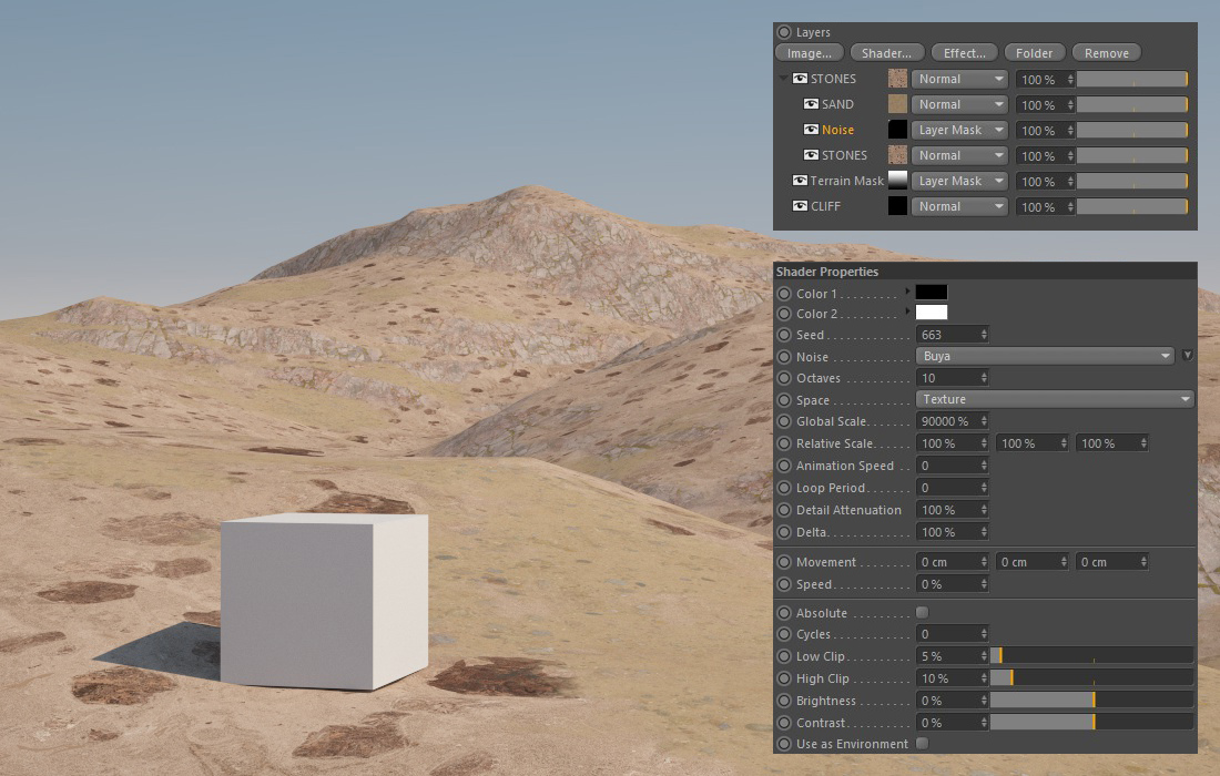 To add more details, I put an additional Noise Shader on top of it. By changing blend mode and opacity, you can control how it will mix together. Here I chose Stupl Noise and adjusted Octaves and Global Scale.