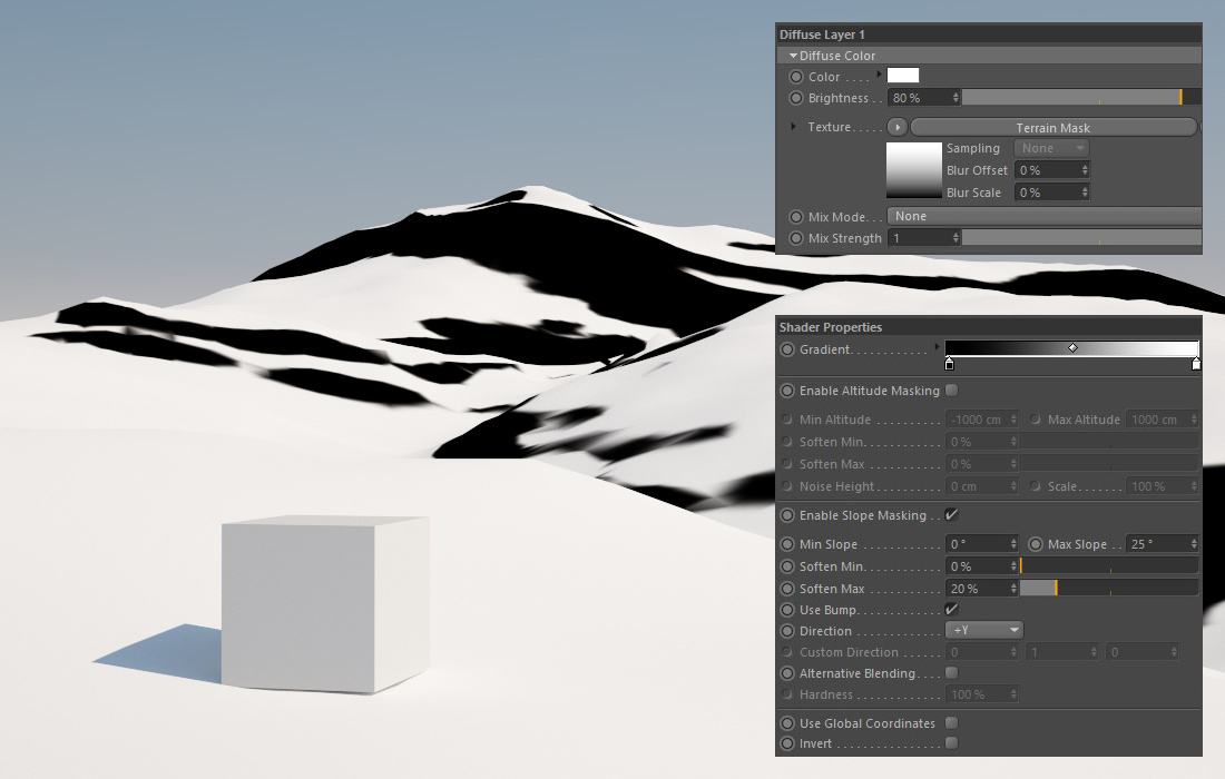 My goal is to have different textures on different slopes. The steeper, the rockier and, the flatter, the sandier. That's what Terrain Mask does. Choose Terrain Mask under Effects by clicking on the little arrow. Adjust as follows: