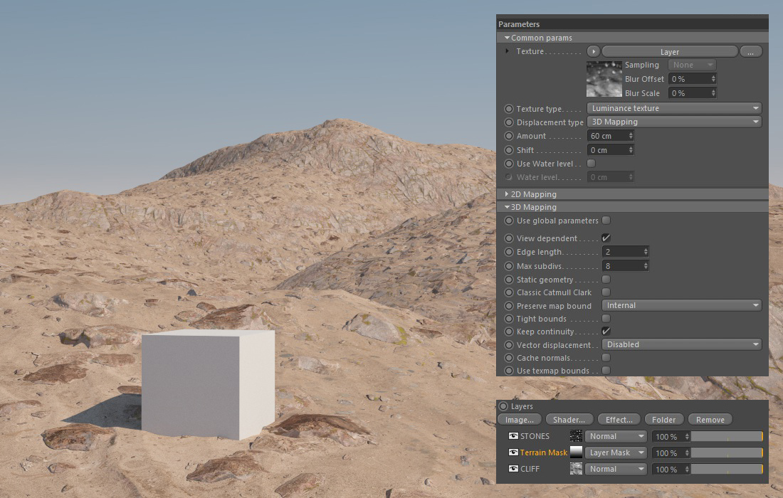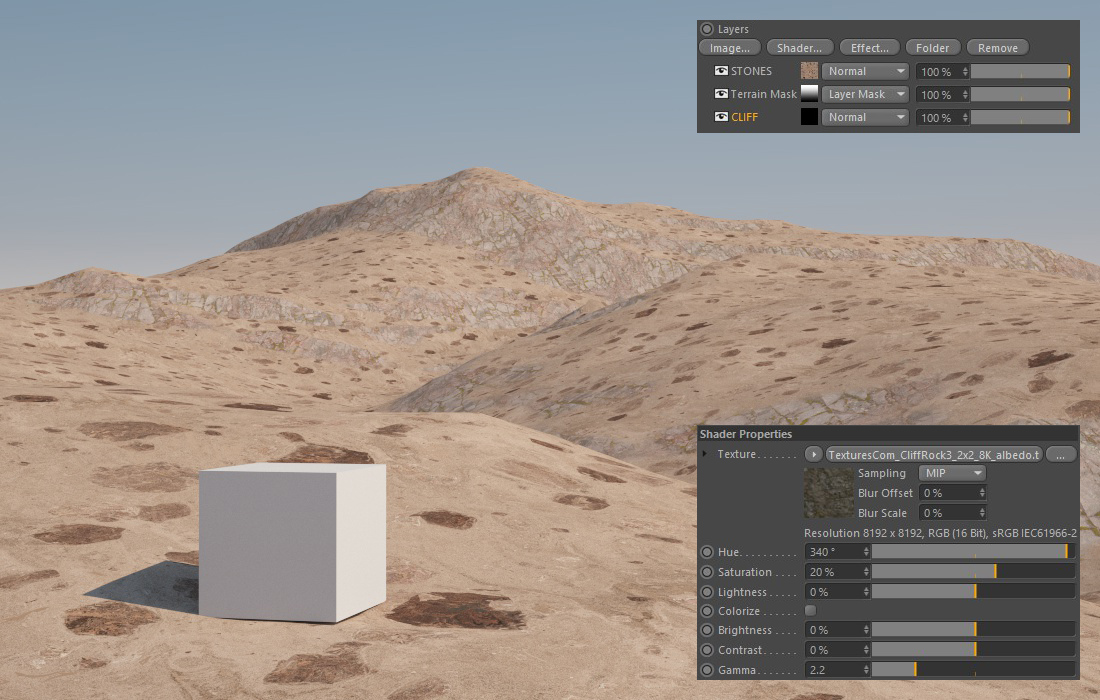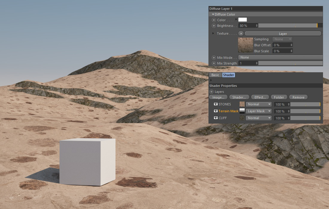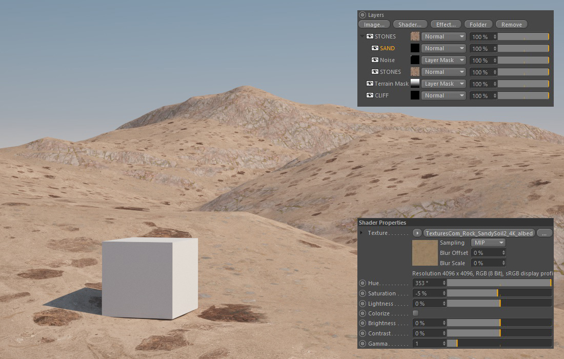 With the same technique I mixed a Sand texture with the Stones texture. I put the Stones texture into a Folder, so it wouldn't affect the previous created Terrain Mask.