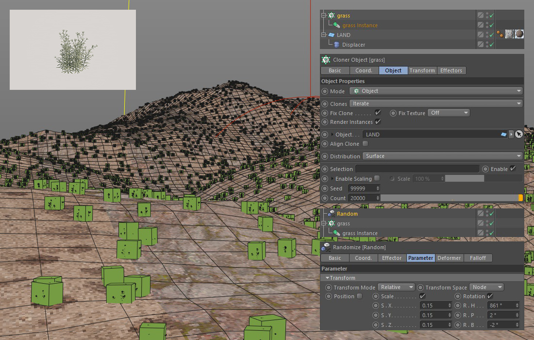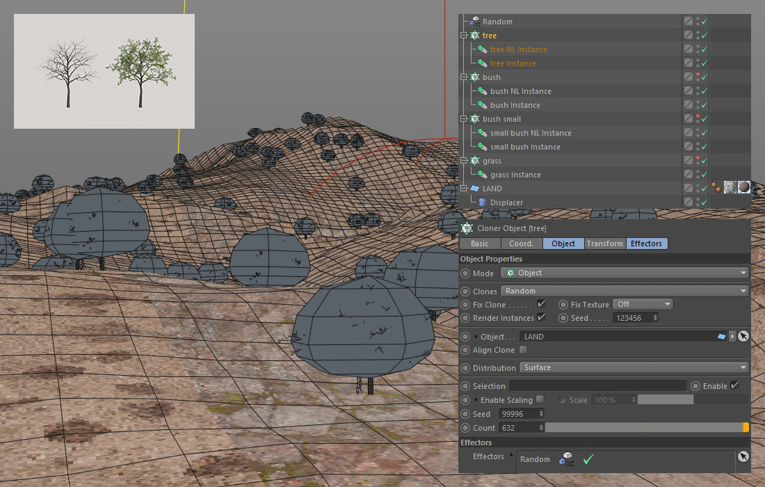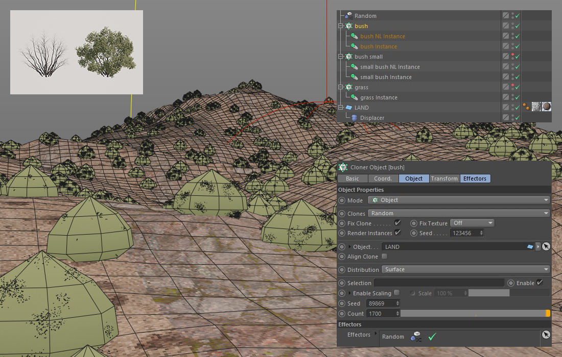 * Make sure every MoGraph Cloner object uses a different Seed number. We could go much further using selections or other distribution plugins, like MultiCloner from Forester. Using a wider variety of plants and different leaves would make it even better. But, as a background element, I think it's totally acceptable.