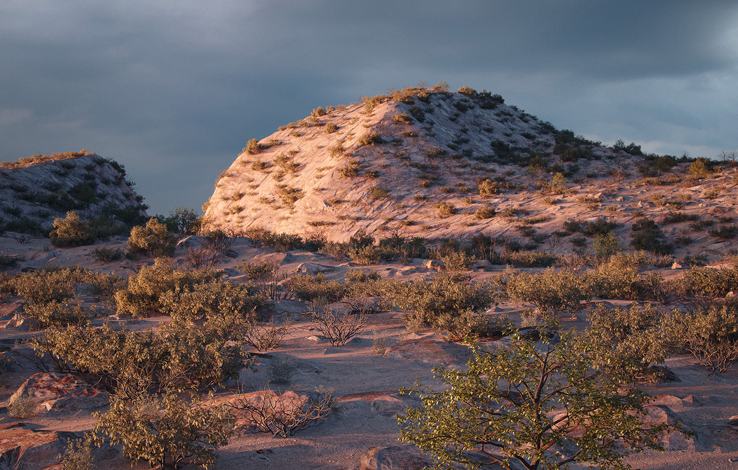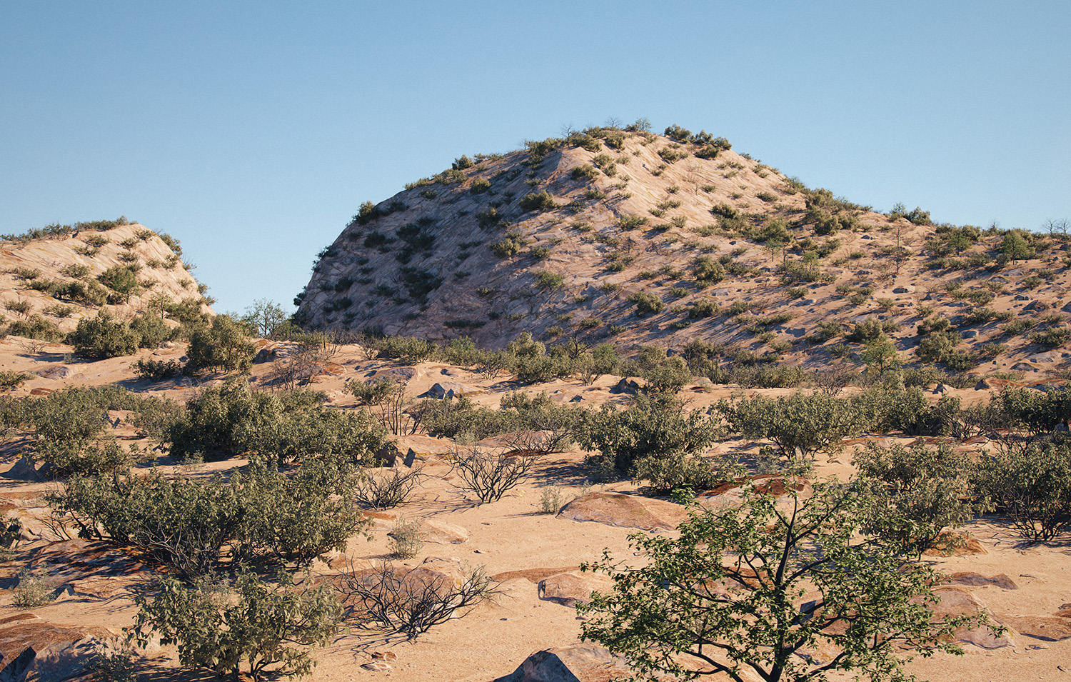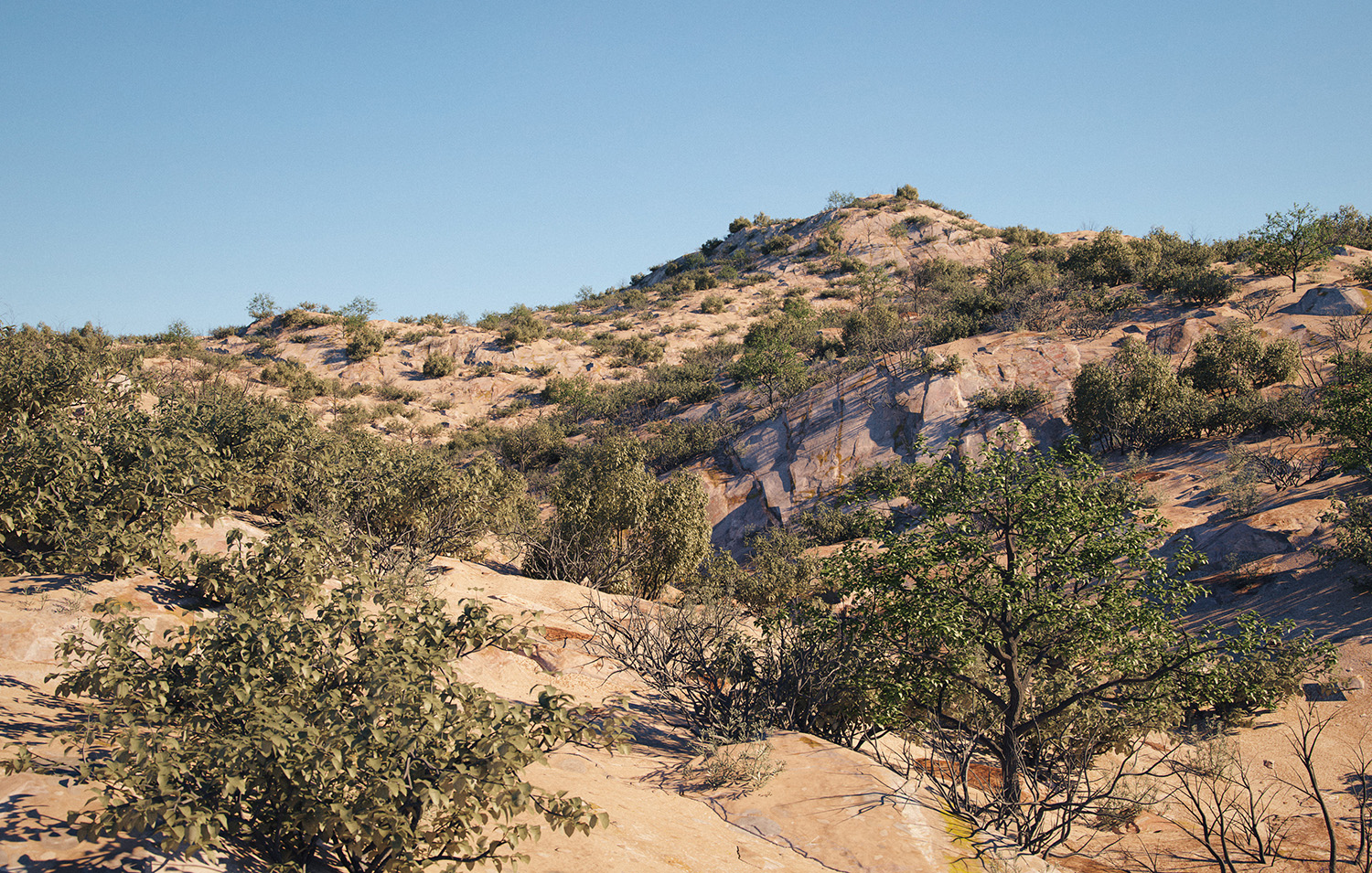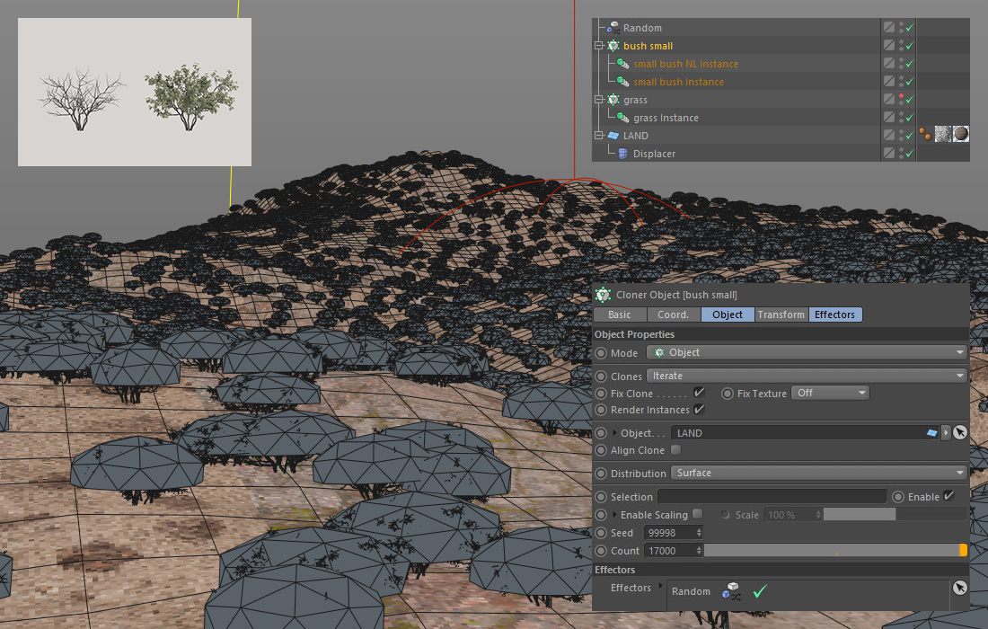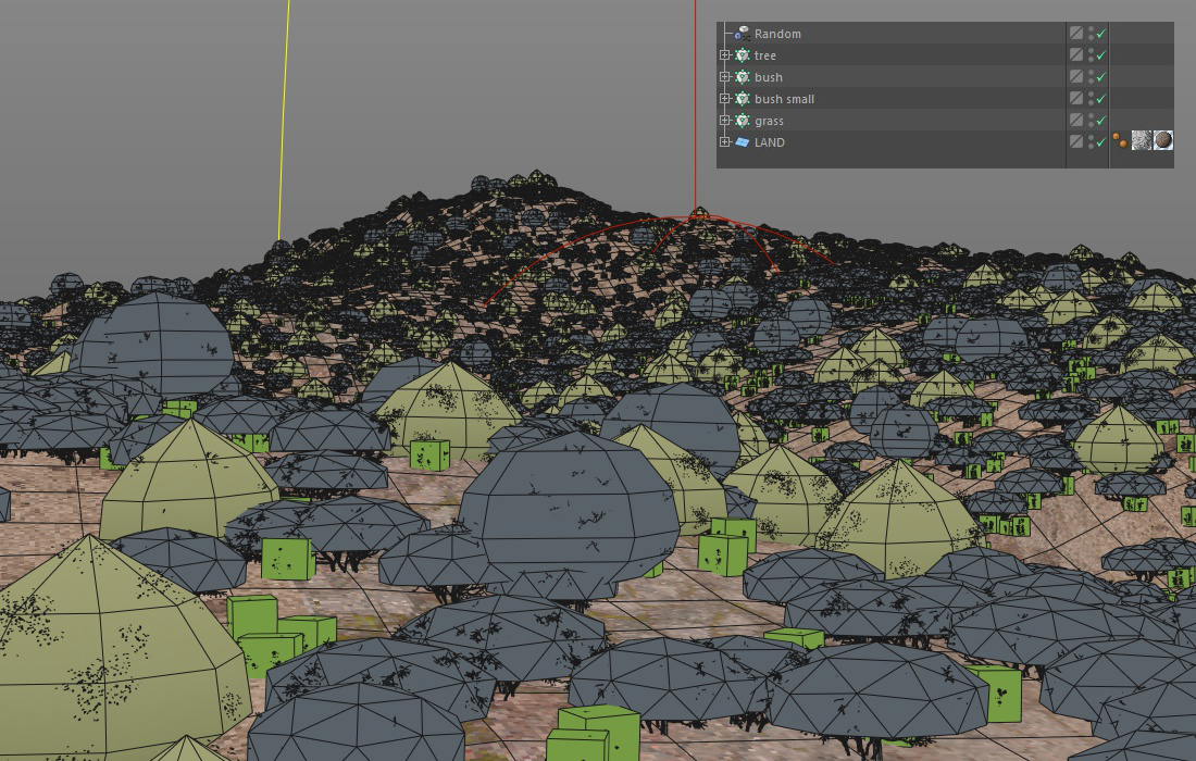 Finally, only vegetation is missing. This is rather straight forward. No secrets here. Using Cinema 4D's MoGraph. I kept it light by only using four different plants (three of them as a no leaf version).